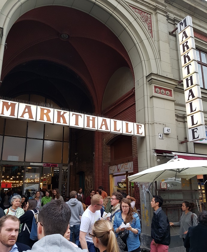 Markthalle Neun is a weekly market in the trendy Berlin neighbourhood of Kreuzberg. We decided to visit during the very popular Street Food Thursday, which takes place 5-10pm. It is preferable to arrive earlier rather than later, because the food runs out. For instance, I never got a chance to try Brammibal’s Vegan Donuts, and they looked delicious.