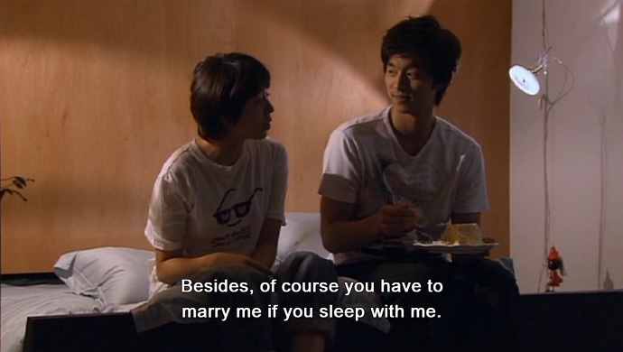 While having Eun Chan over to his place for dinner and a movie, Han Gyul proposes that she move with him to New York in a month. Eun Chan initially objects, because she does not want to get married, yet. Han Gyul points out that a couple can sleep with each other and live together without getting married. Eun Chan’s look of dismay prompts him to offer that they be neighbours instead.